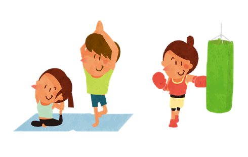 全身運動や自重トレーニング、縄跳び、ジョギングなどの有酸素運動、サンドバッグやミット打ち、ボクササイなどができます。